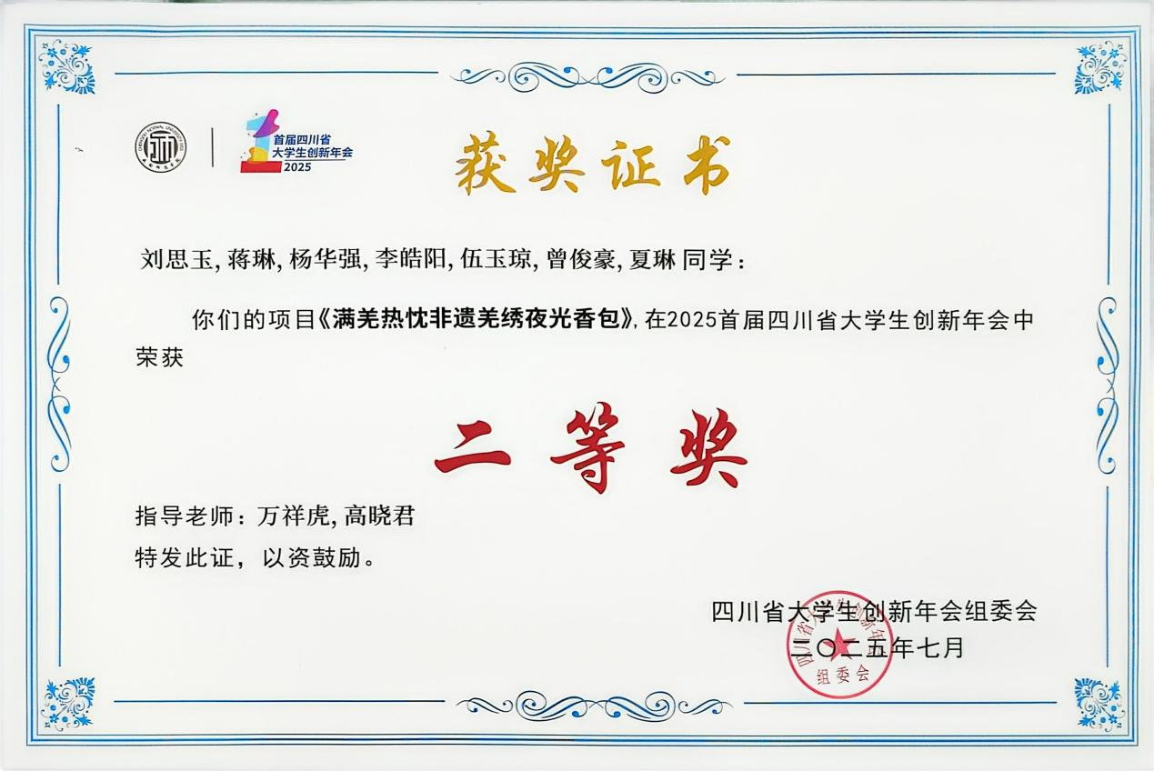 【本网讯】2025年7月4-6日,由四川省教育厅主办,成都师范学院承办,西南交通大学协办的首届大学生创新年会成功举办,本次大会吸引了包括四川大学、电子科技大学等省内40余所高校的上百支队伍踊跃参与。校团委推荐项目《满羌热忱夜光精油香包》在指导教师万祥虎的带领下,凭借出色表现荣获二等奖,充分展示了我校在创新创业教育的实力。
